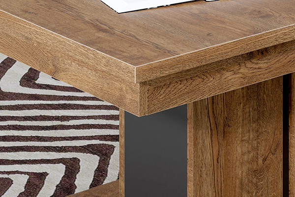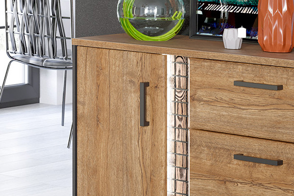 Kolekcja mebli DORIAN wyróżnia się swoim niebanalnym wyglądem, który doskonale sprawdzi się zarówno w tradycyjnych jak nowoczesnych wnętrzach. Niepowtarzalną cechą mebli jest listwa wykonana z naturalnego drewna, która poddana indywidualnej obróbce oraz podświetleniu LED ukazuje swoje piękno. Meble wykonane zostały z wysokiej jakości płyty laminowanej oraz MDF w pięknym kolorze dąb april z wstawkami w kolorze czarnym. W kolekcji oprócz podświetlenia LED listew znajdziemy system cichego domyku drzwi, prowadnice kulkowe z pełnym wysuwem oraz hartowane szkło szyb frontowych w kolorze szarym.